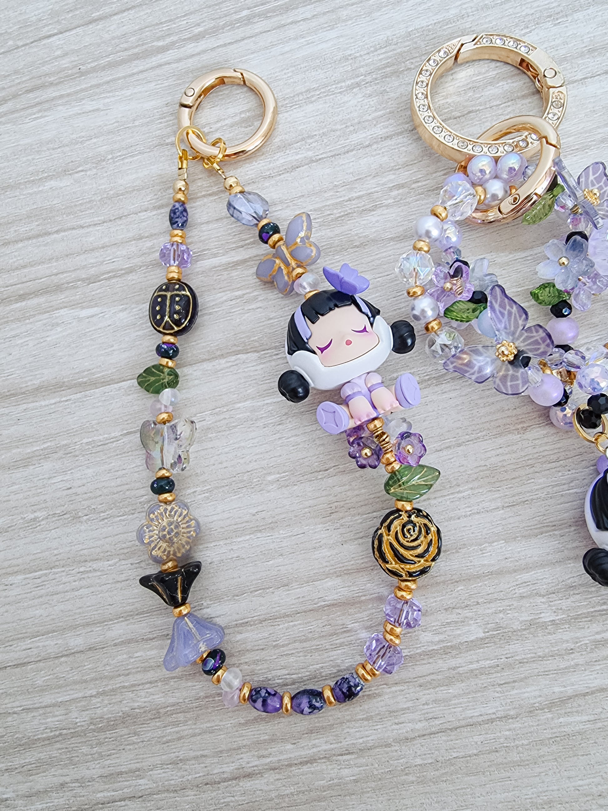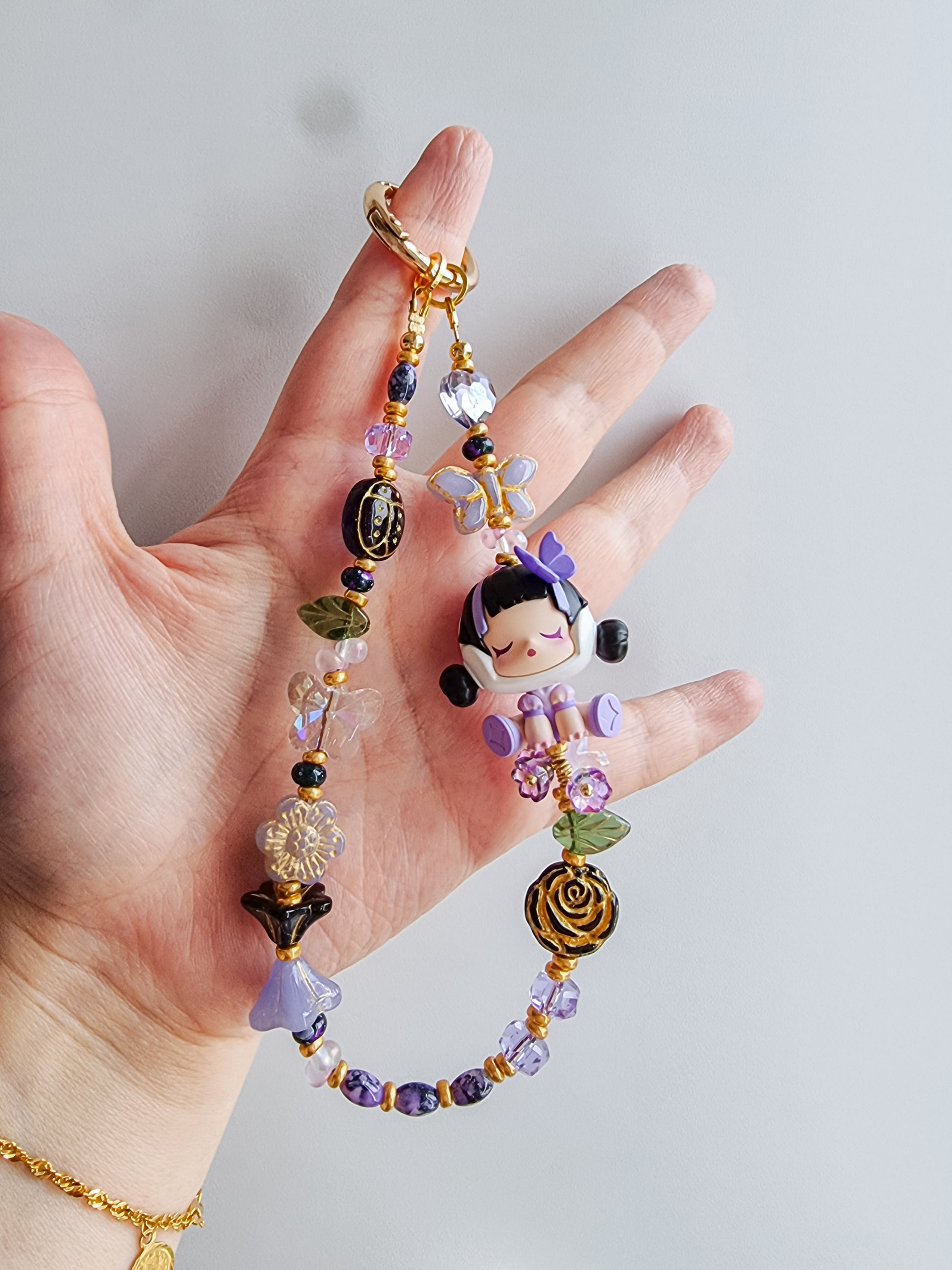 Made with glass beads, beetle, butterfly and floral accents
